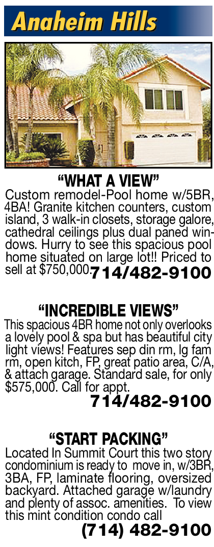 Anaheim Hills “WHAT A VIEW” Custom remodel-Pool home w/5BR, 4BA! Granite kitchen counters, custom island, 3 walk-in closets, storage galore, cathedral ceilings plus dual paned windows. Hurry to see this spacious pool home situated on large lot!! Priced to sell at $750,000. 714/482-9100 “INCREDIBLE VIEWS” This spacious 4BR home not only overlooks a lovely pool & spa but has beautiful city light views! Features sep din rm, lg fam rm, open kitch, FP, great patio area, C/A, & attach garage. Standard sale, for only $575,000. Call for appt. 714/482-9100 “START PACKING” Located In Summit Court this two story condominium is ready to move in, w/3BR, 3BA, FP, laminate flooring, oversized backyard. Attached garage w/laundry and plenty of assoc. amenities. To view this mint condition condo call (714) 482-9100