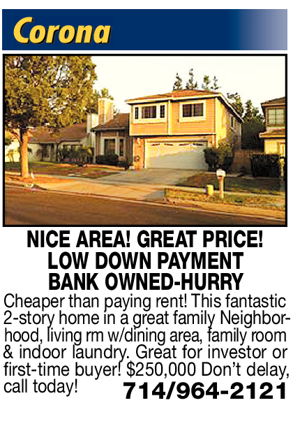 LOW DOWN PAYMENT BANK OWNED-HURRY Cheaper than paying rent! This fantastic 2-story home in a great family Neighborhood, living rm w/dining area, family room & indoor laundry. Great for investor or first-time buyer! $250,000 Don’t delay, call today! 714/964-2121