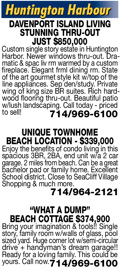 Huntington Harbour DAVENPORT ISLAND LIVING STUNNING THRU-OUT JUST $850,000 Custom single story estate in Huntington Harbor. Newer windows thru-out. Dramatic & spac liv rm warmed by a custom fireplace. Elegant frml dining rm. State of the art gourmet style kit w/top of the line appliances. Sep den/study. Private wing of king size BR suites. Rich hardwood flooring thru-out. Beautiful patio w/lush landscaping. Call today - priced to sell! 714/969-6100 “WHAT A DUMP” BEACH COTTAGE $374,900 Bring your imagination & tools!! Single story, family room w/walls of glass, pool sized yard. Huge corner lot w/semi-circular drive + handyman’s dream garage!! Ready for a loving family. This could be yours. Call now. 714/969-6100 UNIQUE TOWNHOME BEACH LOCATION - $339,000 Enjoy the benefits of condo living in this spacious 3BR, 2BA, end unit w/a 2 car garage. 2 miles from beach. Can be a great bachelor pad or family home. Excellent School district. Close to SeaCliff Village Shopping & much more. 714/964-2121