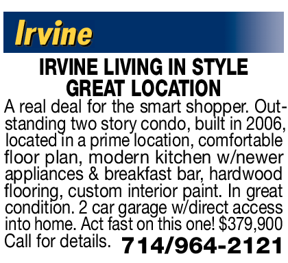 IRVINE LIVING IN STYLE GREAT LOCATION A real deal for the smart shopper. Outstanding two story condo, built in 2006, located in a prime location, comfortable floor plan, modern kitchen w/newer appliances & breakfast bar, hardwood