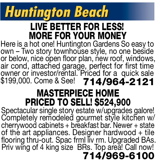 Huntington Beach LIVE BETTER FOR LESS! MORE FOR YOUR MONEY Here is a hot one! Huntington Gardens So easy to own – Two story townhouse style, no one beside or below, nice open floor plan, new roof, windows, air cond, attached garage, perfect for first time owner or investor/rental. Priced for a quick sale $199,000. Come & See! 714/964-2121 MASTERPIECE HOME PRICED TO SELL! $524,900 Spectacular single story estate w/upgrades galore! Completely remodeled gourmet style kitchen w/ cherrywood cabinets + breakfast bar. Newer + state of the art appliances. Designer hardwood + tile flooring thru-out. Spac frml liv rm. Upgraded BAs. Priv wing of 4 king size BRs. Top area! Call now! 714/969-6100