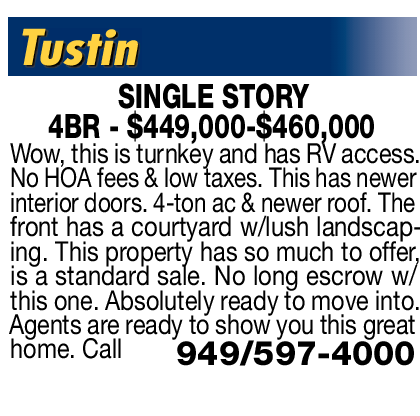 Tustin SINGLE STORY 4BR - $449,000-$460,000 Wow, this is turnkey and has RV access. No HOA fees & low taxes. This has newer interior doors. 4-ton ac & newer roof. The front has a courtyard w/lush landscaping. This property has so much to offer, is a standard sale. No long escrow w/ this one. Absolutely ready to move into. Agents are ready to show you this great home. Call 949/597-4000