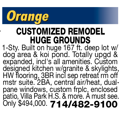 CUSTOMIZED REMODEL HUGE GROUNDS 1-Sty. Built on huge 167 ft. deep lot w/ dog area & koi pond. Totally upgd & expanded, incl's all amenities. Custom designed kitchen w/granite & skylights, HW flooring, 3BR incl sep retreat rm off mstr suite. 2BA, central air/heat, dualpane windows, custom frplc, enclosed patio, Villa Park H.S. & more. A must see. Only $494,000. 714/482-9100