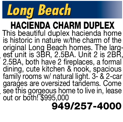 Long Beach HACIENDA CHARM DUPLEX This beautiful duplex hacienda home is historic in nature w/the charm of the original Long Beach homes. The largest unit is 3BR, 2.5BA. Unit 2 is 2BR, 2.5BA, both have 2 fireplaces, a formal dining, cute kitchen & nook, spacious family rooms w/ natural light. 3- & 2-car garages are oversized tandems. Come see this gorgeous home to live in, lease out or both! $995,000 949/257-4000