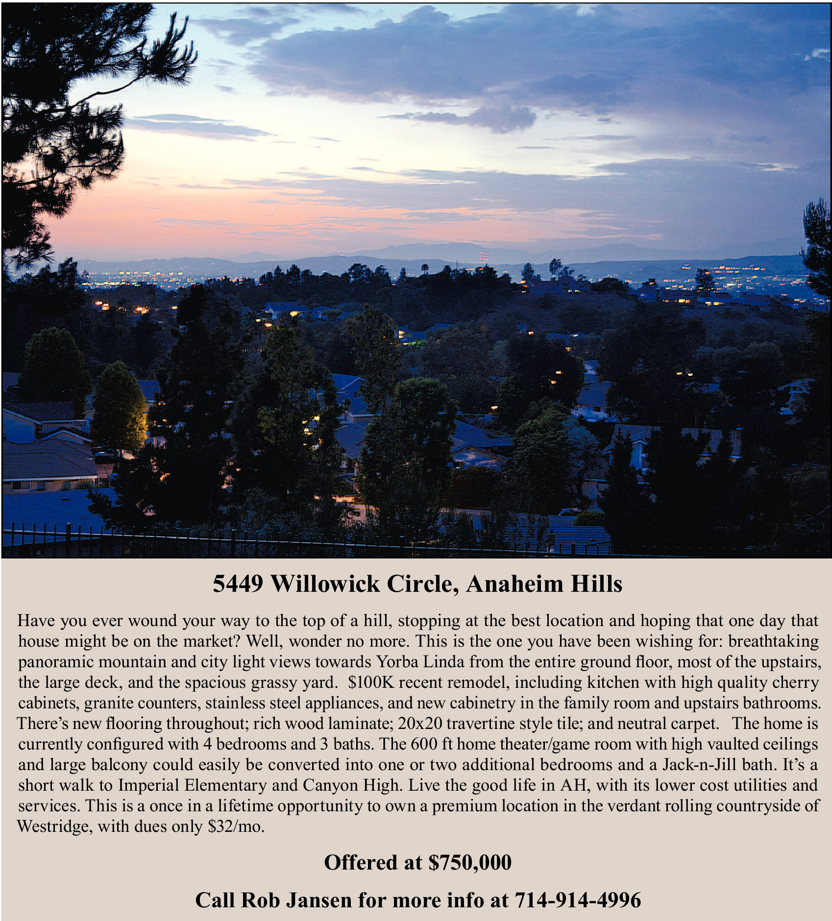Have you ever wound your way to the top of a hill, stopping at the best location and hoping that one day that house might be on the market? Well, wonder no more. This is the one you have been wishing for: breathtaking panoramic mountain and city light views towards Yorba Linda from the entire ground floor, most of the upstairs, the large deck, and the spacious grassy yard. $100K recent remodel, including kitchen with high quality cherry cabinets, granite counters, stainless steel appliances, and new cabinetry in the family room and upstairs bathrooms.