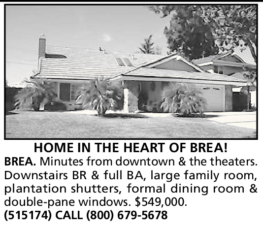 BREA. Minutes from downtown & the theaters. Downstairs BR & full BA, large family room, plantation shutters, formal dining room & double-pane windows. $549,000. (515174) CALL (800) 679-5678