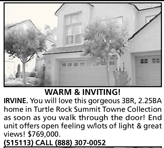 IRVINE. You will love this gorgeous 3BR, 2.25BA home in Turtle Rock Summit Towne Collection as soon as you walk through the door! End unit offers open feeling w/lots of light & great views! $769,000. (515113) CALL (888) 307-0052