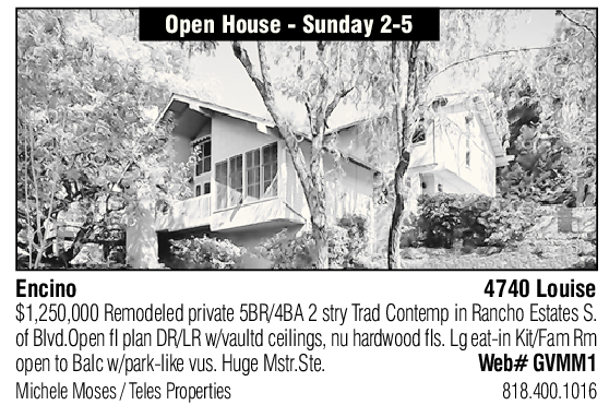 Encino 4740 Louise $1,250,000 Remodeled private 5BR/4BA 2 stry Trad Contemp in Rancho Estates S. of Blvd.Open l plan DR/LR w/vaultd ceilings, nu hardwood ls. Lg eat-in Kit/Fam Rm open to Balc w/park-like vus. Huge Mstr.Ste. Web# GVMM1 Michele Moses / Teles Properties 818.400.1016