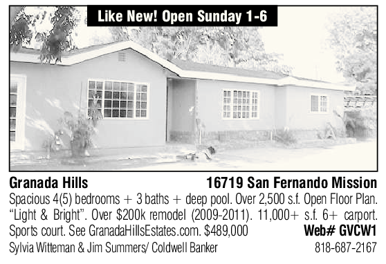 Granada Hills 16719 San Fernando Mission Spacious 4(5) bedrooms + 3 baths + deep pool. Over 2,500 s.f. Open Floor Plan. “Light & Bright”. Over $200k remodel (2009-2011). 11,000+ s.f. 6+ carport. Sports court. See GranadaHillsEstates.com. $489,000 Web# GVCW1 Sylvia Witteman & Jim Summers/ Coldwell Banker 818-687-2167
