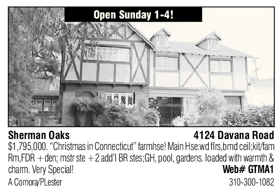 Sherman Oaks 4124 Davana Road $1,795,000. “Christmas in Connecticut” farmhse! Main Hse:wd lrs,bmd ceil;kit/fam Rm,FDR +den; mstr ste +2 add’l BR stes;GH, pool, gardens. loaded with warmth & charm. Very Special! Web# GTMA1 A Comora/PLester 310-300-1082