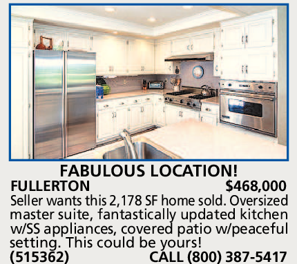 FULLERTON $468,000 Seller wants this 2,178 SF home sold. Oversized master suite, fantastically updated kitchen w/SS appliances, covered patio w/peaceful setting. This could be yours! (515362) CALL (800) 387-5417