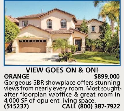 ORANGE $899,000 Gorgeous 5BR showplace offers stunning views from nearly every room. Most soughtafter floorplan w/office & great room in 4,000 SF of opulent living space. (515237) CALL (800) 387-7922