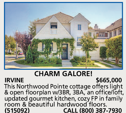 IRVINE $665,000 This Northwood Pointe cottage offers light & open floorplan w/3BR, 3BA, an office/loft, updated gourmet kitchen, cozy FP in family room & beautiful hardwood floors. (515092) CALL (800) 387-7930