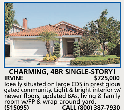 IRVINE $725,000 Ideally situated on large CDS in prestigious gated community. Light & bright interior w/ newer floors, updated BAs, living & family room w/FP & wrap-around yard. (515095) CALL (800) 387-7930