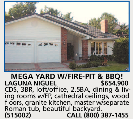 LAGUNA NIGUEL $654,900 CDS, 3BR, loft/office, 2.5BA, dining & living rooms w/FP, cathedral ceilings, wood floors, granite kitchen, master w/separate Roman tub, beautiful backyard. (515002) CALL (800) 387-1455