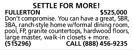 FULLERTON $525,000 Don’t compromise. You can have a great, 5BR, 3BA, ranch-style home w/formal dining room, pool, FP, granite countertops, hardwood floors, large master, walk-in closets + more. (515296) CALL (888) 456-9235