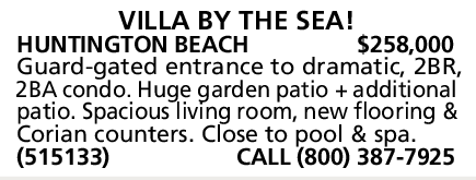 HUNTINGTON BEACH $258,000 Guard-gated entrance to dramatic, 2BR, 2BA condo. Huge garden patio + additional patio. Spacious living room, new flooring & Corian counters. Close to pool & spa. (515133) CALL (800) 387-7925