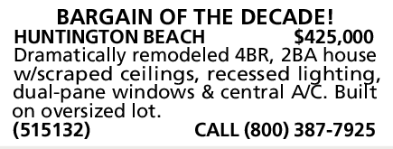 HUNTINGTON BEACH $425,000 Dramatically remodeled 4BR, 2BA house w/scraped ceilings, recessed lighting, dual-pane windows & central A/C. Built on oversized lot. (515132) CALL (800) 387-7925
