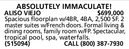 ALISO VIEJO $699,000 Spacious floorplan w/4BR, 4BA, 2,500 SF. 2 master suites w/French doors. Formal living & dining rooms, family room w/FP. Spectacular, tropical pool, spa, waterfalls. (515094) CALL (800) 387-7930