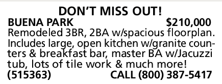 BUENA PARK $210,000 Remodeled 3BR, 2BA w/spacious floorplan. Includes large, open kitchen w/granite counters & breakfast bar, master BA w/Jacuzzi tub, lots of tile work & much more! (515363) CALL (800) 387-5417