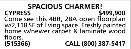 CYPRESS $499,900 Come see this 4BR, 2BA open floorplan w/2,118 SF of living space. Freshly painted home w/newer carpet & laminate wood floors. (515366) CALL (800) 387-5417