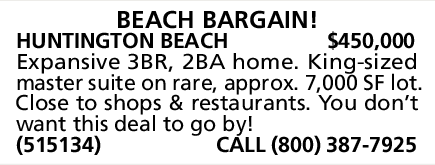 HUNTINGTON BEACH $450,000 Expansive 3BR, 2BA home. King-sized master suite on rare, approx. 7,000 SF lot. Close to shops & restaurants. You don’t want this deal to go by! (515134) CALL (800) 387-7925