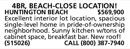 HUNTINGTON BEACH $569,900 Excellent interior lot location, spacious single-level home in pride-of-ownership neighborhood. Sunny kitchen w/tons of cabinet space, breakfast bar. New roof!