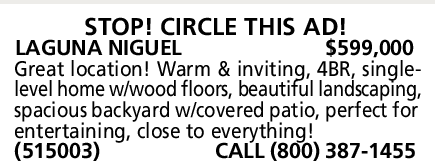 LAGUNA NIGUEL $599,000 Great location! Warm & inviting, 4BR, singlelevel home w/wood floors, beautiful landscaping, spacious backyard w/covered patio, perfect for entertaining, close to everything! (515003) CALL (800) 387-1455