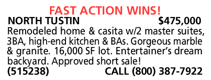 NORTH TUSTIN $475,000 Remodeled home & casita w/2 master suites, 3BA, high-end kitchen & BAs. Gorgeous marble & granite. 16,000 SF lot. Entertainer’s dream backyard. Approved short sale! (515238) CALL (800) 387-7922