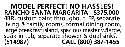 MODEL PERFECT! NO HASSLES! RANCHO SANTA MARGARITA $375,000 4BR, custom paint throughout, FP, separate living & family rooms, formal dining room, large breakfast island, spacious master w/large, soak-in tub, separate shower & dual sinks. (514987) CALL (800) 387-1455