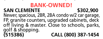 SAN CLEMENTE $302,900 Newer, spacious, 2BR, 2BA condo w/2 car garage, FP, granite counters, upgraded cabinets, deck off living & master. Close to schools, parks, golf & shopping.