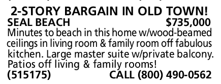 2-STORY BARGAIN IN OLD TOWN! SEAL BEACH $735,000 Minutes to beach in this home w/wood-beamed ceilings in living room & family room off fabulous kitchen. Large master suite w/private balcony. Patios off living & family rooms! (515175) CALL (800) 490-0562