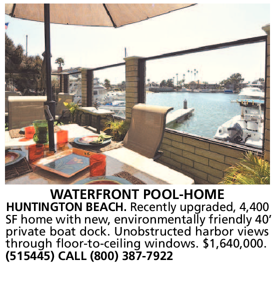 WATERFRONT POOL-HOME HUNTINGTON BEACH. Recently upgraded, 4,400 SF home with new, environmentally friendly 40’ private boat dock. Unobstructed harbor views through floor-to-ceiling windows. $1,640,000. (515445) CALL (800) 387-7922