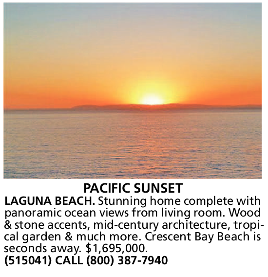 PACIFIC SUNSET LAGUNA BEACH. Stunning home complete with panoramic ocean views from living room. Wood & stone accents, mid-century architecture, tropical garden & much more. Crescent Bay Beach is seconds away. $1,695,000. (515041) CALL (800) 387-7940