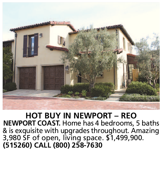 HOT BUY IN NEWPORT – REO NEWPORT COAST. Home has 4 bedrooms, 5 baths & is exquisite with upgrades throughout. Amazing 3,980 SF of open, living space. $1,499,900. (515260) CALL (800) 258-7630