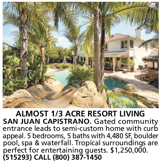 ALMOST 1/3 ACRE RESORT LIVING SAN JUAN CAPISTRANO. Gated community entrance leads to semi-custom home with curb appeal. 5 bedrooms, 5 baths with 4,480 SF, boulder pool, spa & waterfall. Tropical surroundings are perfect for entertaining guests. $1,250,000. (515293) CALL (800) 387-1450