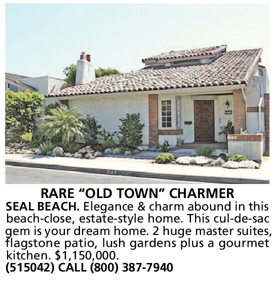 RARE “OLD TOWN” CHARMER SEAL BEACH. Elegance & charm abound in this beach-close, estate-style home. This cul-de-sac gem is your dream home. 2 huge master suites, flagstone patio, lush gardens plus a gourmet kitchen. $1,150,000. (515042) CALL (800) 387-7940
