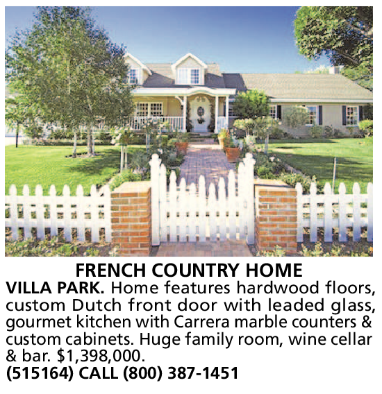FRENCH COUNTRY HOME VILLA PARK. Home features hardwood floors, custom Dutch front door with leaded glass, gourmet kitchen with Carrera marble counters & custom cabinets. Huge family room, wine cellar & bar. $1,398,000.