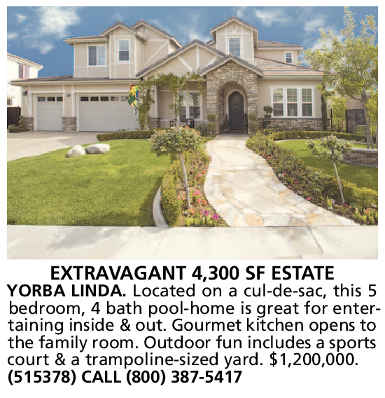 EXTRAVAGANT 4,300 SF ESTATE YORBA LINDA. Located on a cul-de-sac, this 5 bedroom, 4 bath pool-home is great for entertaining inside & out. Gourmet kitchen opens to the family room. Outdoor fun includes a sports court & a trampoline-sized yard. $1,200,000. (515378) CALL (800) 387-5417