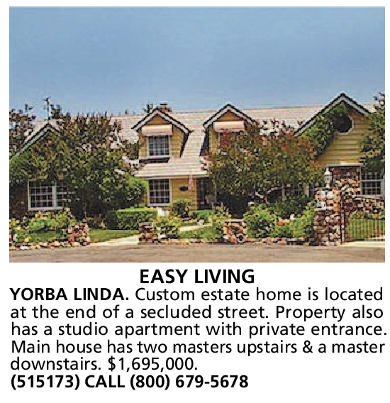 EASY LIVING YORBA LINDA. Custom estate home is located at the end of a secluded street. Property also has a studio apartment with private entrance. Main house has two masters upstairs & a master downstairs. $1,695,000.