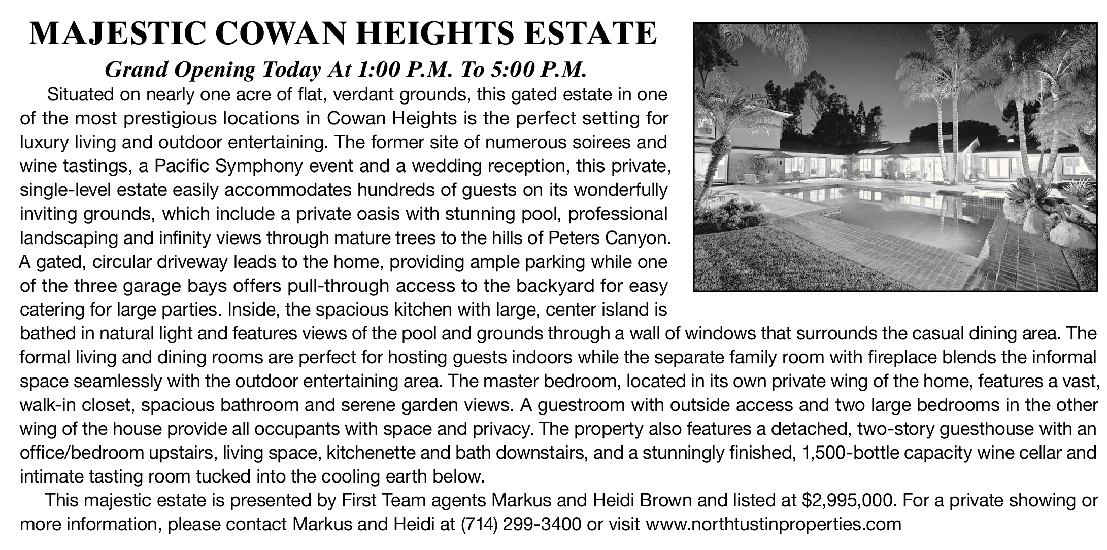 This majestic estate is presented by First Team agents Markus and Heidi Brown and listed at $2,995,000. For a private showing or more information, please contact Markus and Heidi at (714) 299-3400 or visit www.northtustinproperties.com