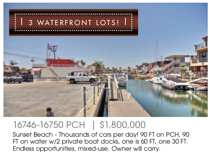 16746-16750 PCH | $1,800,000 Sunset Beach - Thousands of cars per day! 90 FT on PCH, 90 FT on water w/2 private boat docks, one is 60 FT, one 30 FT. Endless opportunities, mixed-use. Owner will carry.