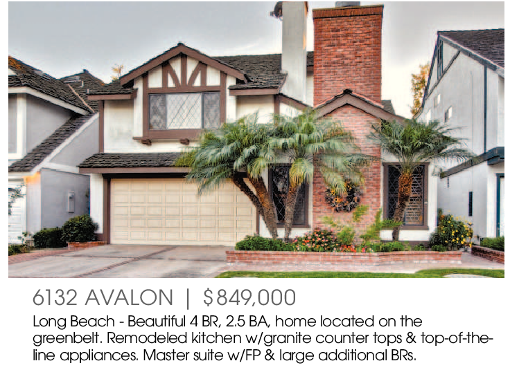 6132 AVALON | $849,000 Long Beach - Beautiful 4 BR, 2.5 BA, home located on the greenbelt. Remodeled kitchen w/granite counter tops & top-of-theline appliances. Master suite w/FP & large additional BRs.