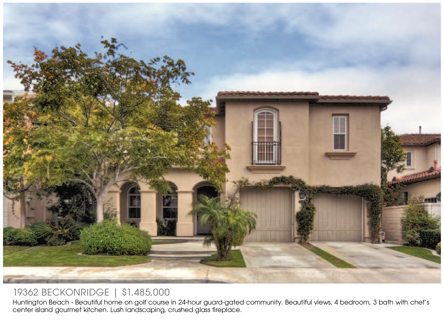 19362 BECKONRIDGE | $1,485,000 Huntington Beach - Beautiful home on golf course in 24-hour guard-gated community. Beautiful views, 4 bedroom, 3 bath with chef’s center island gourmet kitchen. Lush landscaping, crushed glass fireplace.
