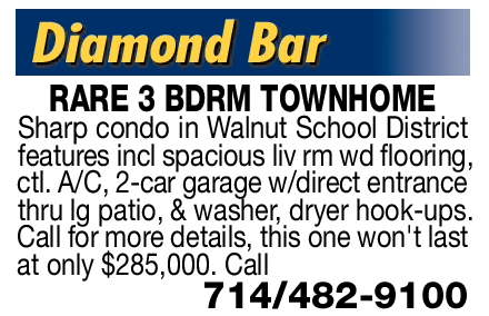 RARE 3 BDRM TOWNHOME Sharp condo in Walnut School District features incl spacious liv rm wd l ooring, ctl. A/C, 2-car garage w/direct entrance thru lg patio, & washer, dryer hook-ups. Call for more details, this one won't last at only $285,000. Call 714/482-9100