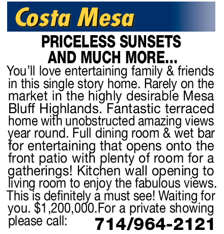 Costa Mesa PRICELESS SUNSETS AND MUCH MORE… You’ll love entertaining family & friends in this single story home. Rarely on the market in the highly desirable Mesa Bluff Highlands. Fantastic terraced home with unobstructed amazing views year round. Full dining room & wet bar for entertaining that opens onto the front patio with plenty of room for a gatherings! Kitchen wall opening to living room to enjoy the fabulous views. This is dei nitely a must see! Waiting for you. $1,200,000.For a private showing please call: 714/964-2121