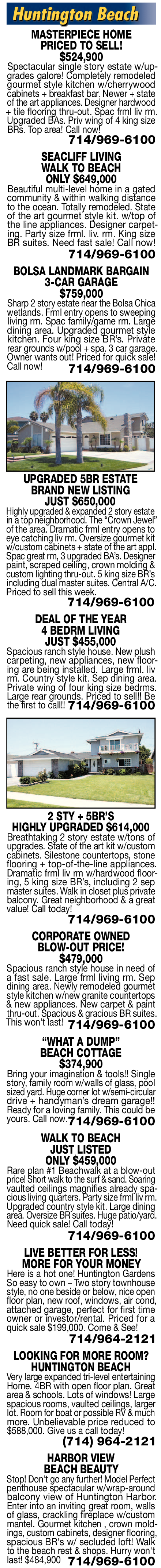 This won’t last! 714/969-6100 “WHAT A DUMP” BEACH COTTAGE $374,900 Bring your imagination & tools!! Single story, family room w/walls of glass, pool sized yard. Huge corner lot w/semi-circular drive + handyman’s dream garage!! Ready for a loving family. This could be yours. Call now. 714/969-6100 WALK TO BEACH JUST LISTED ONLY $459,000 Rare plan #1 Beachwalk at a blow-out price! Short walk to the surf & sand. Soaring vaulted ceilings magniies already spacious living quarters. Party size frml liv rm.