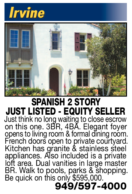 Irvine SPANISH 2 STORY JUST LISTED - EQUITY SELLER Just think no long waiting to close escrow on this one. 3BR, 4BA. Elegant foyer opens to living room & formal dining room. French doors open to private courtyard. Kitchen has granite & stainless steel appliances. Also included is a private loft area. Dual vanities in large master BR. Walk to pools, parks & shopping. Be quick on this only $595,000. 949/597-4000