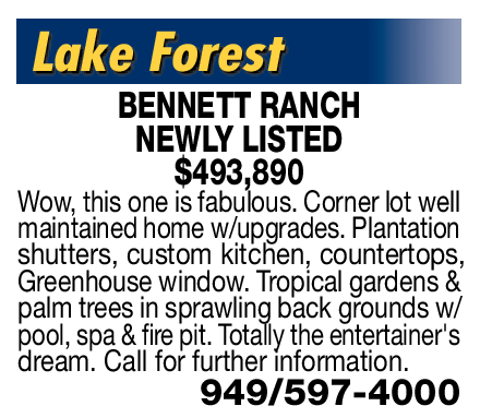 Lake Forest BENNETT RANCH NEWLY LISTED $493,890 Wow, this one is fabulous. Corner lot well maintained home w/upgrades. Plantation shutters, custom kitchen, countertops, Greenhouse window. Tropical gardens & palm trees in sprawling back grounds w/ pool, spa & ire pit. Totally the entertainer's dream. Call for further information. 949/597-4000