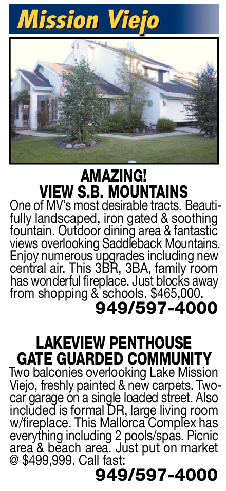 Mission Viejo AMAZING! VIEW S.B. MOUNTAINS One of MV’s most desirable tracts. Beautifully landscaped, iron gated & soothing fountain. Outdoor dining area & fantastic views overlooking Saddleback Mountains. Enjoy numerous upgrades including new central air. This 3BR, 3BA, family room has wonderful ireplace. Just blocks away from shopping & schools. $465,000. 949/597-4000 LAKEVIEW PENTHOUSE GATE GUARDED COMMUNITY Two balconies overlooking Lake Mission Viejo, freshly painted & new carpets. Twocar garage on a single loaded street. Also included is formal DR, large living room w/ireplace. This Mallorca Complex has everything including 2 pools/spas. Picnic area & beach area. Just put on market @ $499,999. Call fast: 949/597-4000 See also